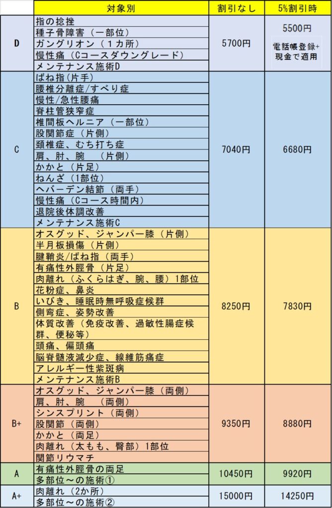 初回時の合計費用は①初見料+②施術料です。 下記費用にライン等ご登録割引で最大7%割引がありますので、ご利用ください。
